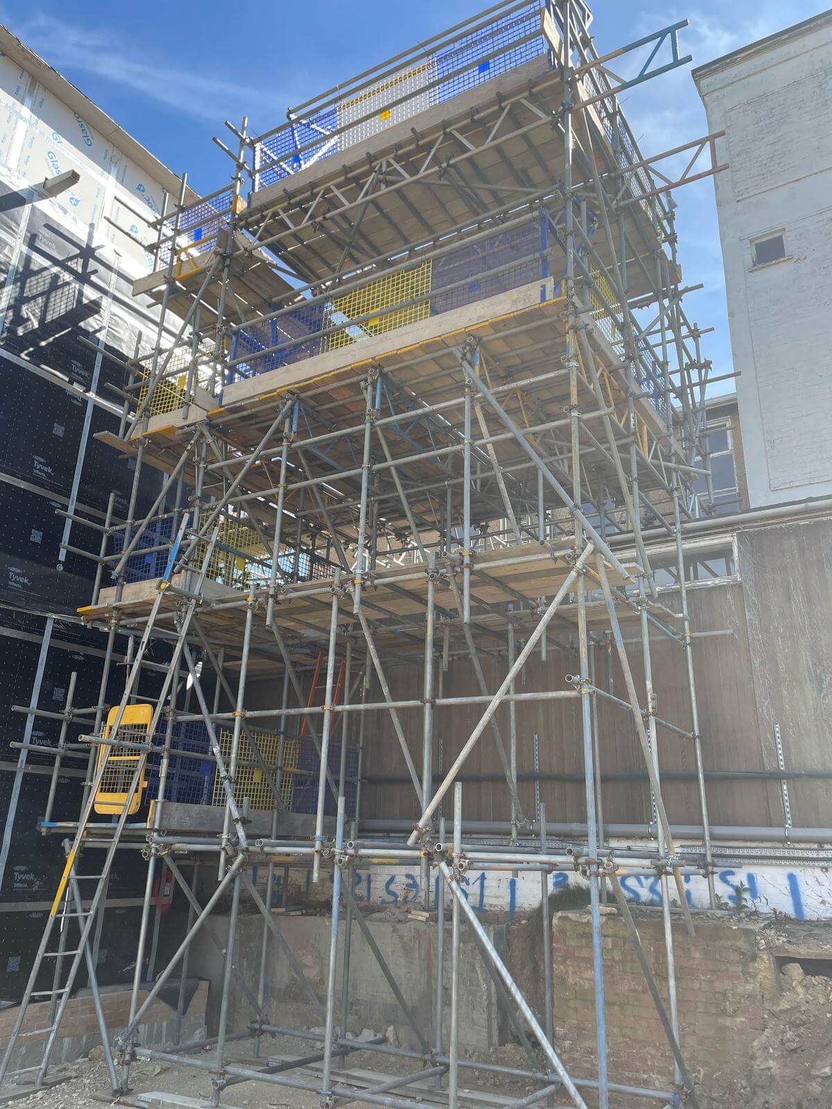 These projects often involve multiple scaffold lifts, edge protection, system staircases, and tight coordination between trades.